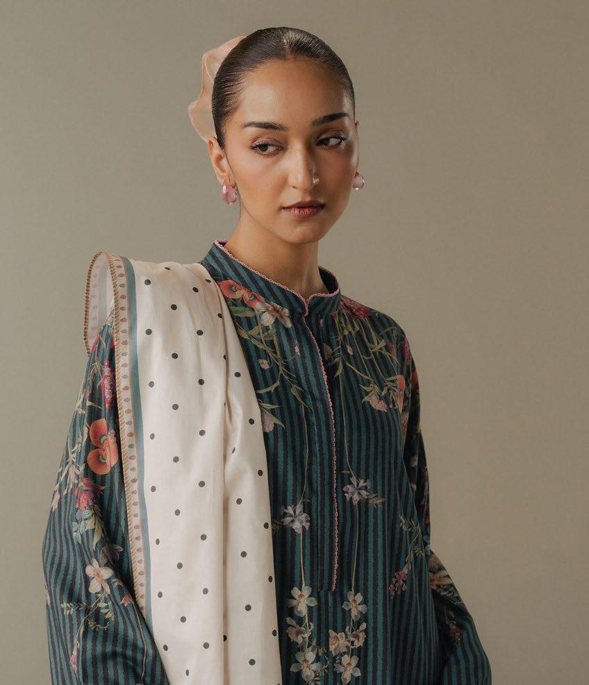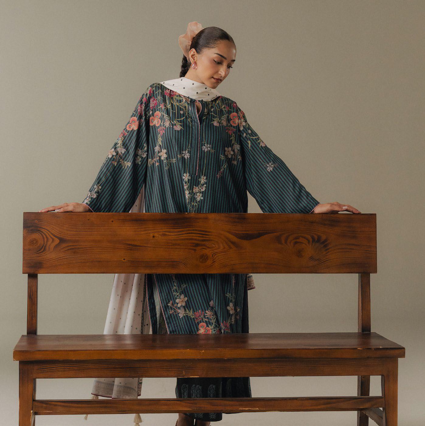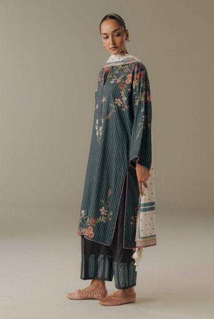 A teal and gray striped shirt inspired by floral elements, paired with a soft gray trouserfeaturing intricate paisley motifs. The ensemble is beautifully tied together with an off-whiteshawl adorned with...