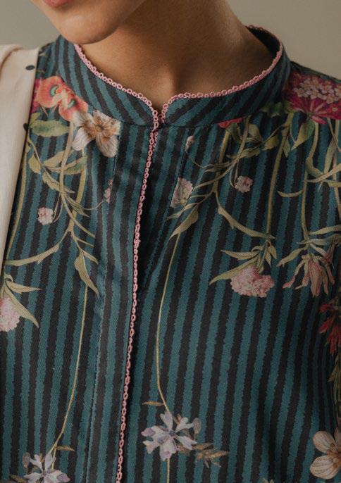 A teal and gray striped shirt inspired by floral elements, paired with a soft gray trouser