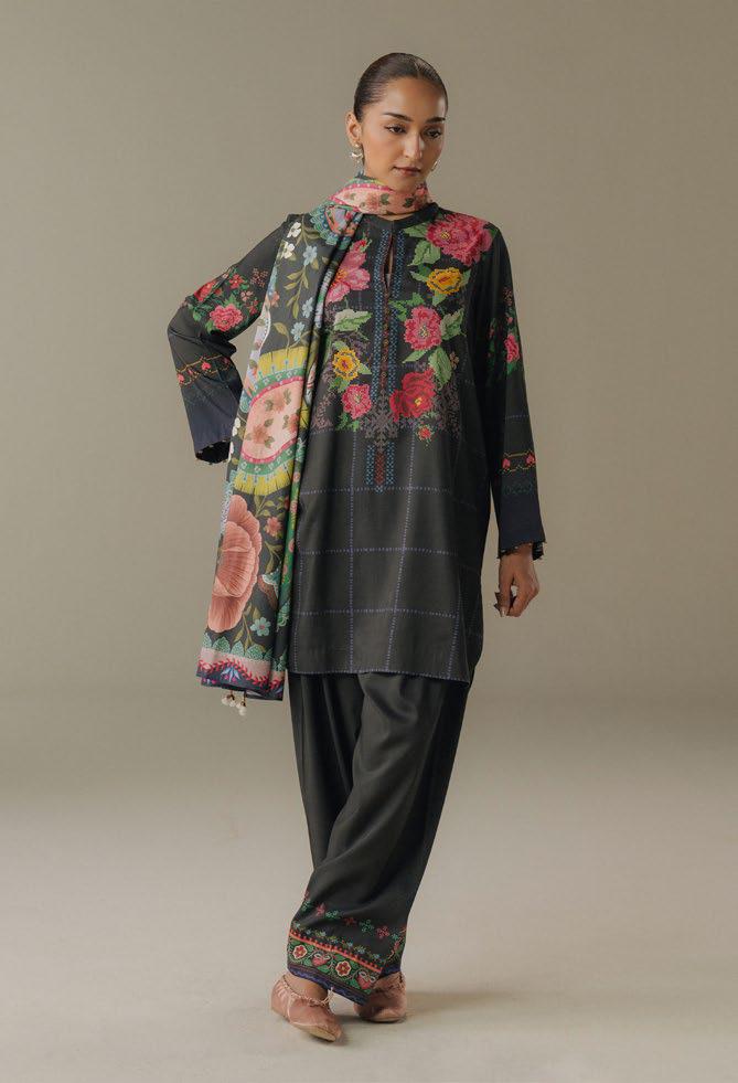 A teal and gray striped shirt inspired by floral elements, paired with a soft gray trouserfeaturing intricate paisley motifs. The ensemble is beautifully tied together with an off-whiteshawl adorned with...
