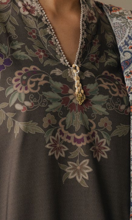 An umber shirt paired with matching umber trousers featuring intricate block print detailing. The look is complemented by a dusty pink shawl adorned with paisley-inspired motifs,creating a warm and graceful ensemble...