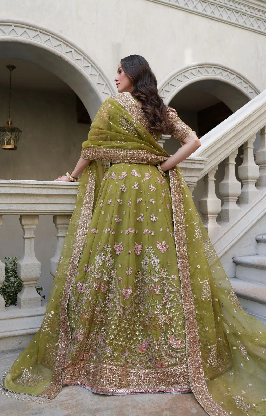 FLORAL PATTERNS. THE LEHENGA-STYLE FLARE ADDS GRANDEUR, MAKING IT A STUNNING CHOICE FOR