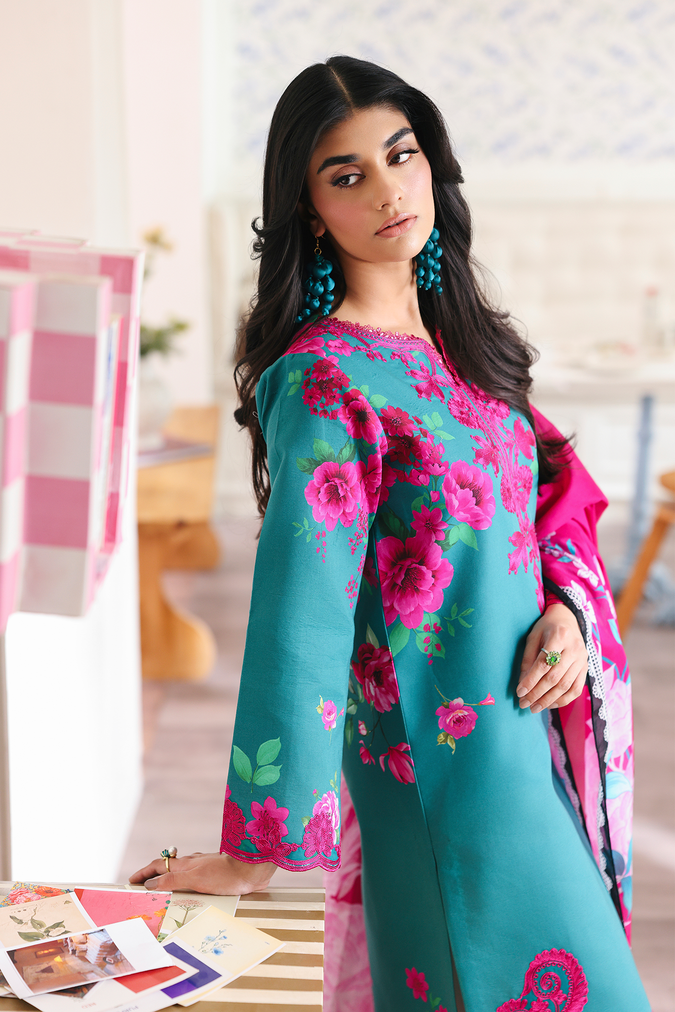 Delicate embroidered borders on the sleeves and hem elevate the design with subtle sophistication. Paired with a digitally printed cotton trouser and a premium printed voil dupatta, this ensemble offers breathable comfort and graceful drape—perfect for warm-weather wear.