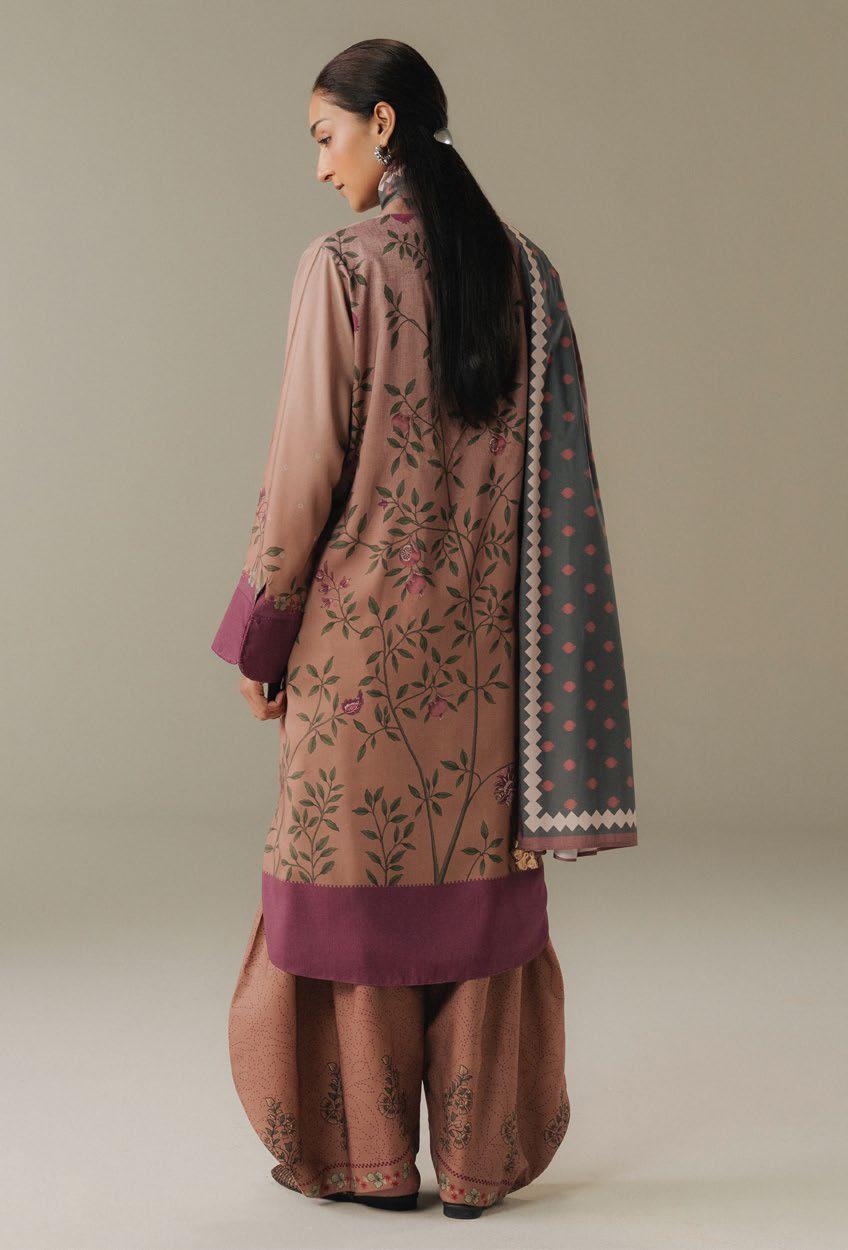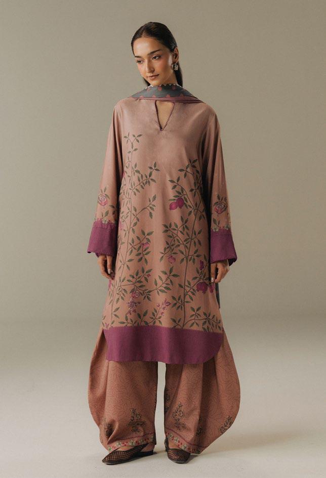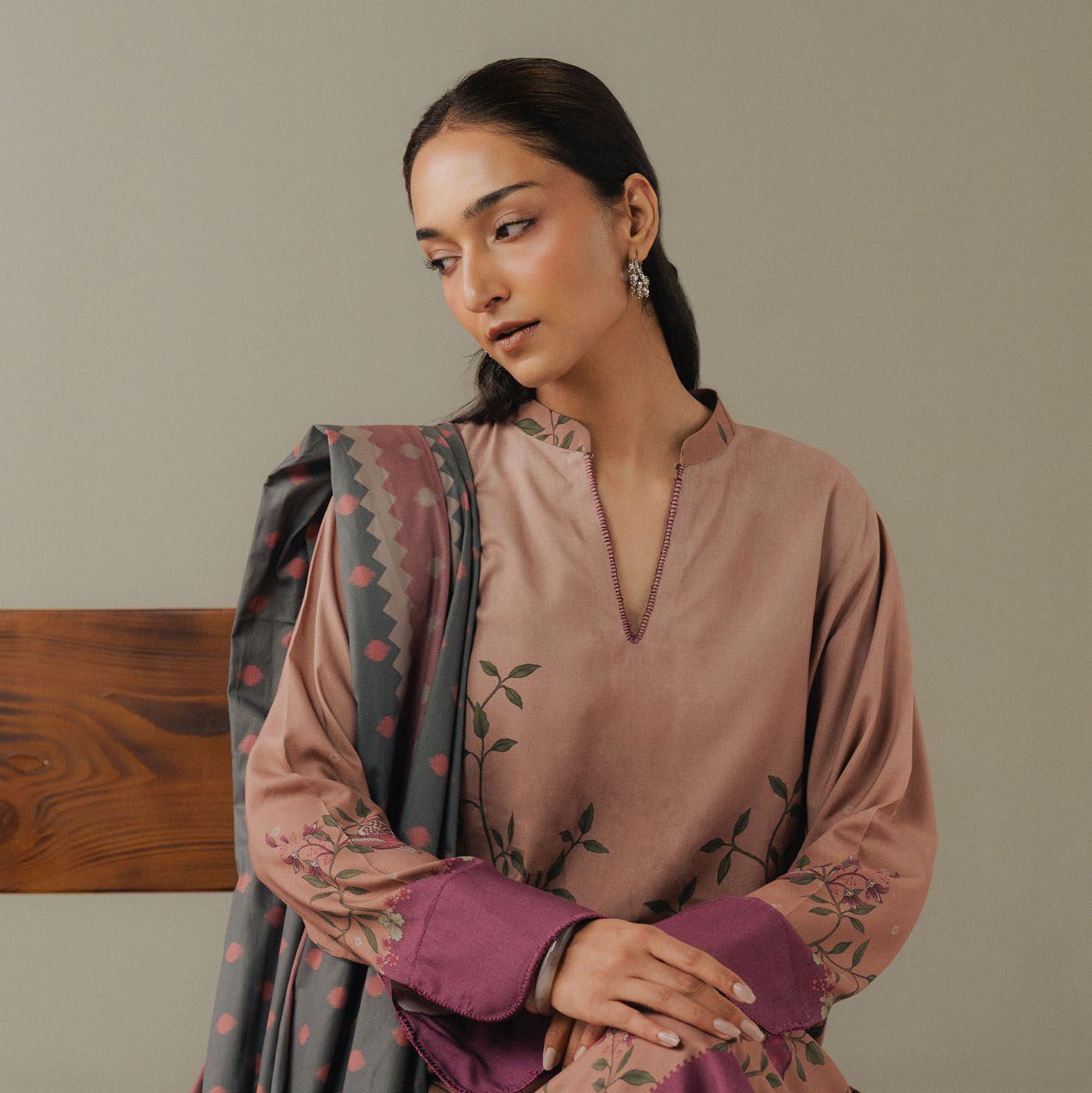 A dusty pink shirt inspired by modern chintz patterns, paired with matching dusty pink trousersfeaturing delicate block print details. The ensemble is beautifully complemented by a shawl insoft shades of...