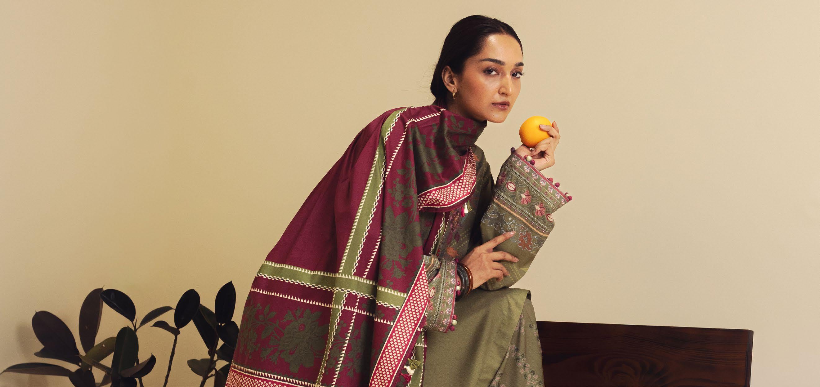featuring delicate block print details. The ensemble is beautifully complemented by a shawl in